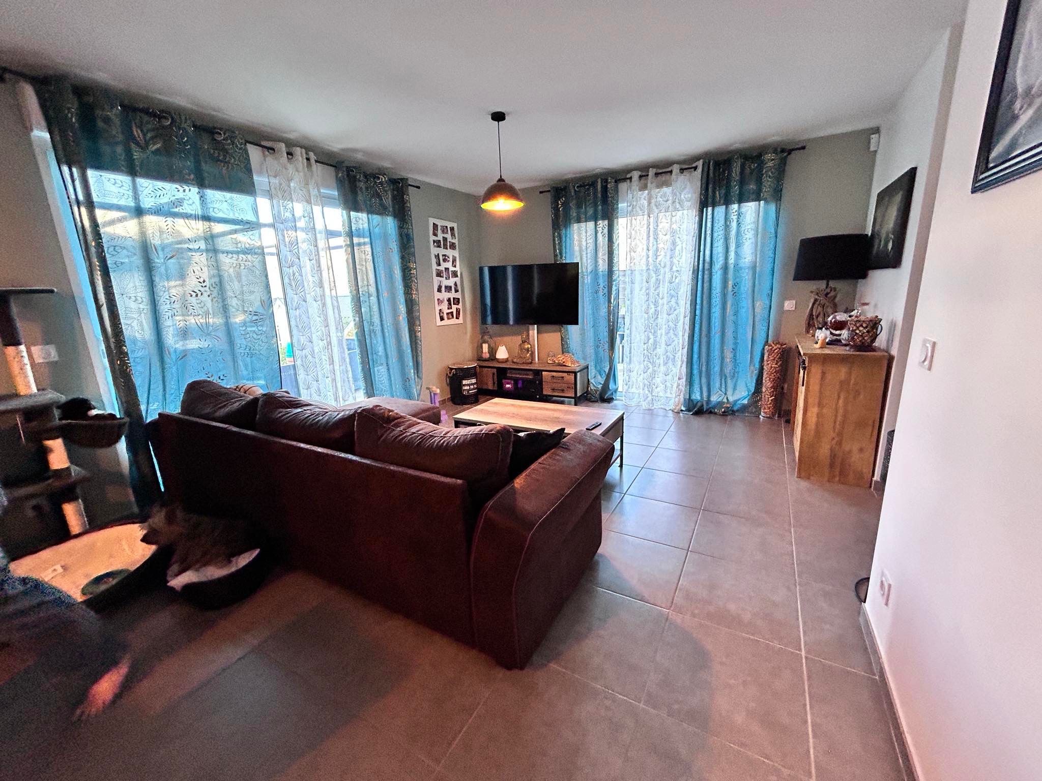 La pièce de vie spacieuse et lumineuse s’ouvre sur la terrasse et le jardin, tandis que la cuisine équipée est ouverte et dispose de son propre cellier attenant.